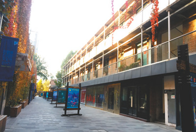 從美術館后街77號院往東南方向走約7公里,就來到了朝陽中心商務區(qū)。這里,入目皆是鱗次櫛比的大廈和高檔商場。不過,商務區(qū)東南角保留了一隅時代的印記,那里還存有原工廠建筑的外立面風格,甚至連窗外的爬藤都未曾驚擾。