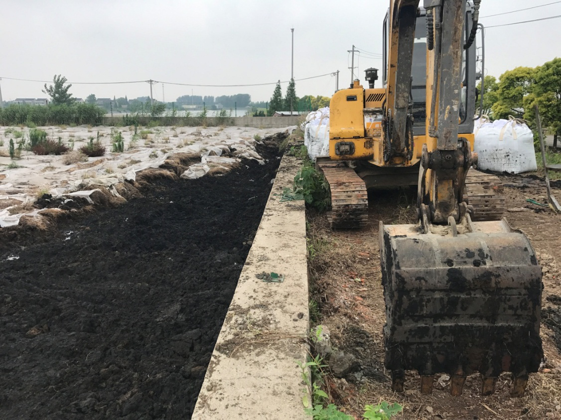 督察人員在南池西側(cè)看到停著一臺小型挖掘機,幾十袋包裝好的污泥擺放在旁邊。泰興市工作人員介紹,正在將少量含水率較低的污泥裝袋,運到危廢儲存場所暫存,最終安全處置。但是從現(xiàn)場情況看,挖掘工作才剛剛開始。