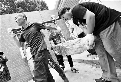 在昨天的文物搬運(yùn)現(xiàn)場(chǎng),兩位工人挑擔(dān)子,兩位工人用手托住龍頭兩邊,四人費(fèi)了好大勁才將螭頭搬到車(chē)上,開(kāi)啟“回家”之路。待螭頭到達(dá)圓明園后,將有專(zhuān)家對(duì)它們進(jìn)行全身“體檢”,制定修復(fù)方案?!斑@些螭頭有一些小裂縫,如果不好好保護(hù),時(shí)間久了容易出問(wèn)題?!眻A明園文物考古科科長(zhǎng)陳輝說(shuō)。(記者 李夢(mèng)婷)
