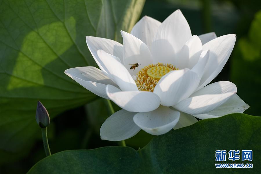 6月14日,在銅陵市西湖村荷花園內(nèi),一只蜜蜂飛向盛開的荷花。隨著氣溫升高,安徽省銅陵市西聯(lián)鎮(zhèn)西湖村荷花園內(nèi)的300多畝荷花絢麗綻放,吸引游客前來賞荷。 新華社記者 張端 攝