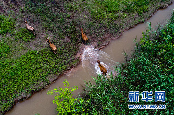 從湖南省林業(yè)廳獲悉,湖南省林業(yè)廳近日在東洞庭湖國家級(jí)自然保護(hù)區(qū)啟動(dòng)無人機(jī)巡護(hù)監(jiān)測時(shí),拍攝到自然野化麋鹿群,共有62頭,這是洞庭湖目前一次性監(jiān)測到的最大種群。2017-05-06 10:41:17
