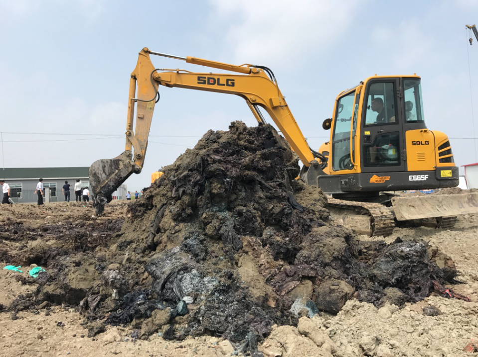 6月15日,也即中央第四環(huán)保督察組下沉泰州市當日,督察人員便調來挖掘機,對群眾舉報區(qū)域隨機選點進行試探性挖掘。讓人沒有想到的是,僅僅數(shù)鏟之后,半米左右的沙土層之下就現(xiàn)出黑色的化工廢料,刺激性氣味強烈。