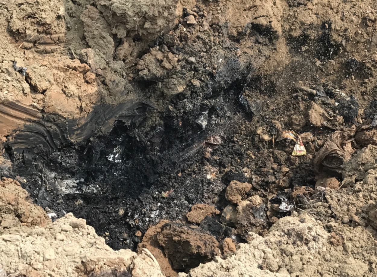 圖2 僅挖數(shù)鏟就現(xiàn)出黑色化工廢料,刺激性氣味強烈