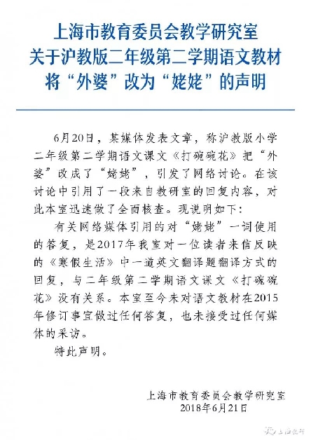 上海市教育委員會(huì)教學(xué)研究室今日發(fā)表關(guān)于滬教版二年級(jí)第二學(xué)期語(yǔ)文教材將“外婆”改為“姥姥”的聲明。聲明稱(chēng),網(wǎng)絡(luò)媒體引用的答復(fù),是2017年研究室對(duì)一位讀者來(lái)信反映的一道英文翻譯題翻譯方式的回復(fù),與二年級(jí)第二學(xué)期語(yǔ)文課文《打碗碗花》沒(méi)有關(guān)系。