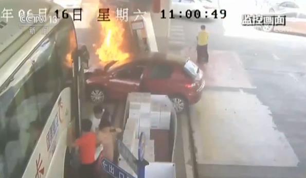 監(jiān)控畫面顯示,6月16日上午11點左右,中石油長沙市岳麓大道加油站內(nèi),一輛紅色轎車突然失控撞倒加油機,隨即引發(fā)大火。