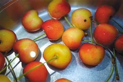 6月26日,鹽水浸泡中的櫻桃,沒有發(fā)現(xiàn)小蟲子。新京報記者 王嘉寧 攝