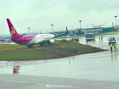 有網(wǎng)友將現(xiàn)場視頻發(fā)布在網(wǎng)絡上,視頻中顯示,一架深圳航空的飛機停在機場跑道旁的草坪上,草坪上有明顯的飛機輪胎印記,多輛救援車輛及機場大巴??吭陲w機附近。