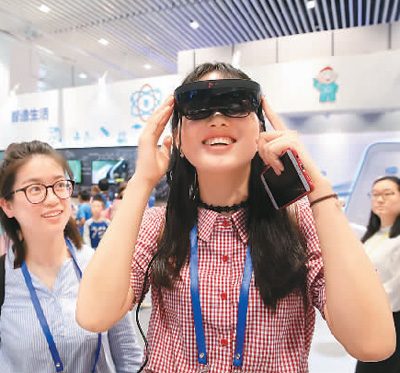 5月19日,參觀(guān)者在北京科技周上體驗(yàn)國(guó)際上首款量產(chǎn)版全高清AR智能眼鏡。陳曉根攝(人民視覺(jué))