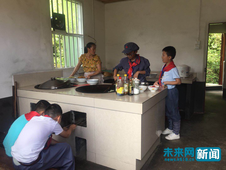 前來井岡山茅坪鄉(xiāng)壩上村體驗“紅軍的一天”教育的小學(xué)生自己動手做飯。未來網(wǎng)記者 楊佩穎 攝
