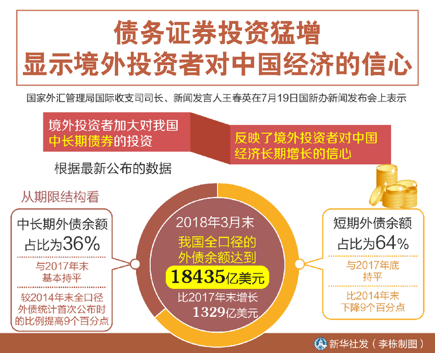 新華社北京7月19日電(記者劉開雄)“我們觀察新增長的外債中,有八成是債務證券?!眹彝鈪R管理局國際收支司司長、新聞發(fā)言人王春英在19日國新辦新聞發(fā)布會上表示,境外投資者加大對我國中長期債券的投資,反映了境外投資者對中國經(jīng)濟長期增長的信心。