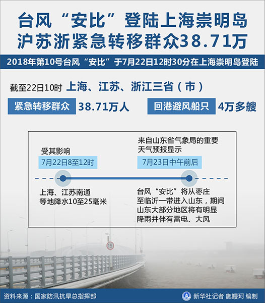 新華社北京7月22日電(記者葉昊鳴、葉婧)記者22日從國家防汛抗旱總指揮部了解到,今年第10號臺風(fēng)“安比”于當(dāng)日12時30分在上海崇明島登陸。截至22日10時,上海、江蘇、浙江三省(市)共緊急轉(zhuǎn)移群眾38.71萬人,有4萬多艘船只回港避風(fēng)。
