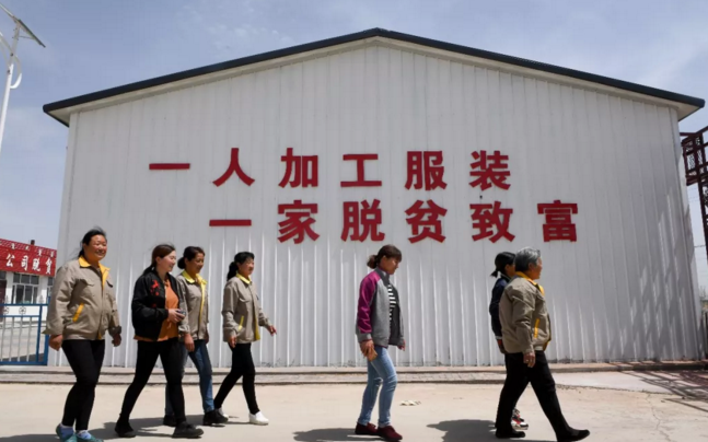 在扶貧車間上班的村民們走出廠門