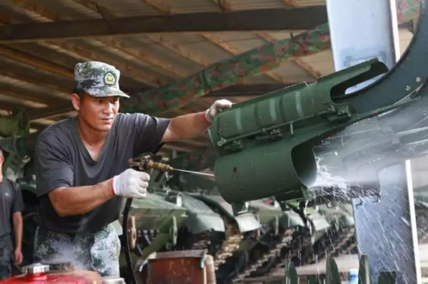 按照規(guī)定,訓練完畢后,需對戰(zhàn)車進行清理保養(yǎng),小編也想上去幫幫忙,手接觸到坦克鋼鐵蓋時,一下子被燙的縮了回來。