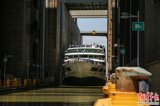 7月31日,湖北省宜昌市,船只準(zhǔn)備進入三峽大壩升船機,進入廂體后這艘100多米長的客船將乘升船機下降80多米,“翻越”大壩。三峽升船機是世界上規(guī)模最大的升船機,也是三峽工程的收官之作。中國青年報·中青在線記者 趙迪/攝