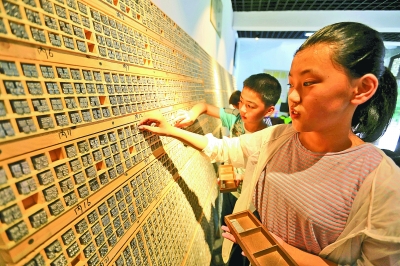 7月16日,山東省臨沂市沂南縣竹泉村,研學(xué)旅行的孩子們?cè)凇皶r(shí)光印記活字印刷體驗(yàn)館”內(nèi)體驗(yàn)活字印刷。暑假期間,各地的孩子們紛紛通過(guò)豐富多彩的形式“學(xué)藝”充電。新華社發(fā)