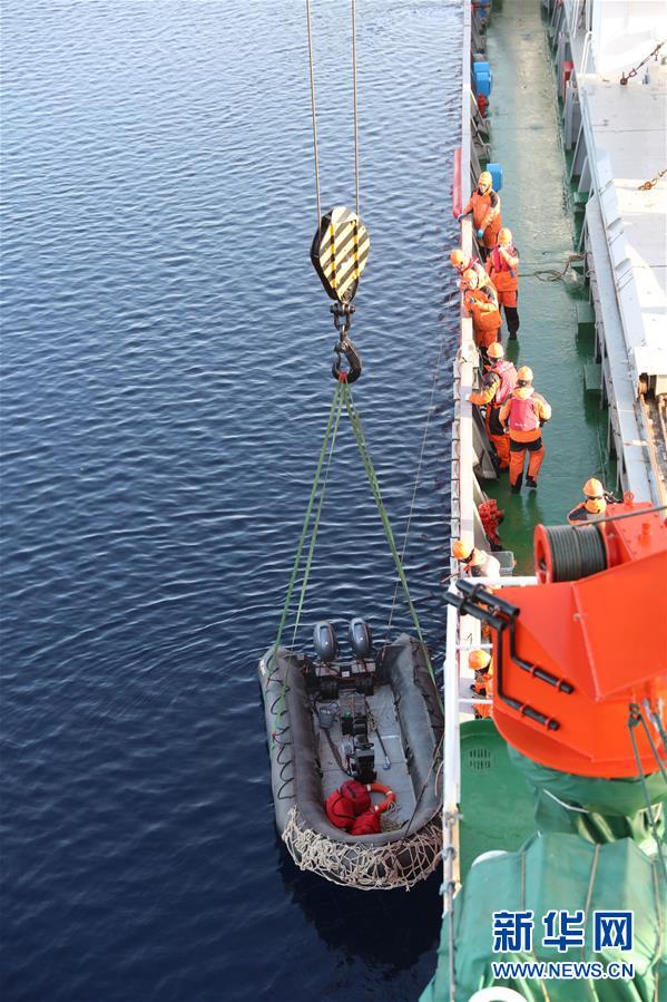 8月1日,北極科考隊(duì)隊(duì)員從“雪龍”號(hào)科考船上放出橡皮艇,準(zhǔn)備乘坐橡皮艇回收錨碇式潛標(biāo)。 新華社記者申鋮攝