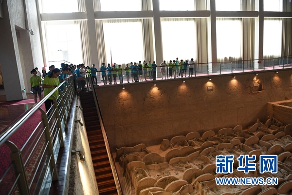 在位于曲沃縣曲村鎮(zhèn)的晉國(guó)博物館,來(lái)自山西省臨汾市的學(xué)生在參觀車(chē)馬坑遺址(7月31日攝)。 新華社記者 楊晨光 攝