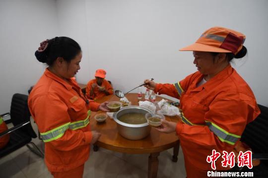 愛心驛站內(nèi),環(huán)衛(wèi)工人李紅霞為工友盛綠豆湯。王剛 攝