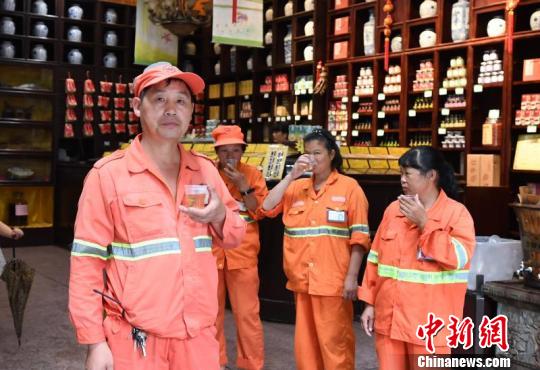 在位于河坊街的方回春堂國(guó)藥館內(nèi),曲徑通幽處,不少橙色的身影正坐在回廊上休息。這些附近的環(huán)衛(wèi)工人大多會(huì)在午后來(lái)方回春堂休憩片刻,喝上一杯“六月神仙茶”。