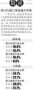 《義務(wù)教育質(zhì)量監(jiān)測(cè)報(bào)告》指出,學(xué)生視力不良問題突出,四年級(jí)、八年級(jí)學(xué)生視力不良檢出率分別為36.5%和65.3%。實(shí)際上,不僅僅只有報(bào)告中義務(wù)教育的學(xué)生存在視力問題,我國(guó)青少年視力的整體情況也十分不樂觀。根據(jù)世界衛(wèi)生組織的最新研究報(bào)告,目前中國(guó)近視患者人數(shù)多達(dá)6億。其中我國(guó)初高中生和大學(xué)生的近視率均已超過七成。我國(guó)青少年近視率已高居世界第一。相比之下,美國(guó)青少年的近視率約為25%,澳大利亞僅為1.3%,德國(guó)的近視率一直控制在15%以下。