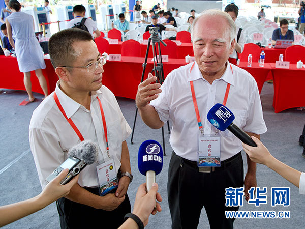 8月5日,在福建晉江舉行的福建向金門供水工程通水現(xiàn)場(chǎng)會(huì)上,來(lái)自金門的王再生老人(右)和福建省水投集團(tuán)公司副總經(jīng)理朱金良(左)接受采訪。 新華社記者 姜克紅 攝