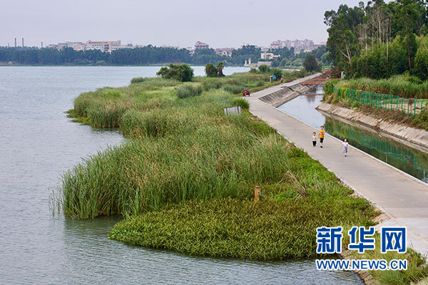 8月4日,幾位小朋友走在福建向金門供水工程取水地晉江龍湖湖畔。新華社記者 姜克紅 攝