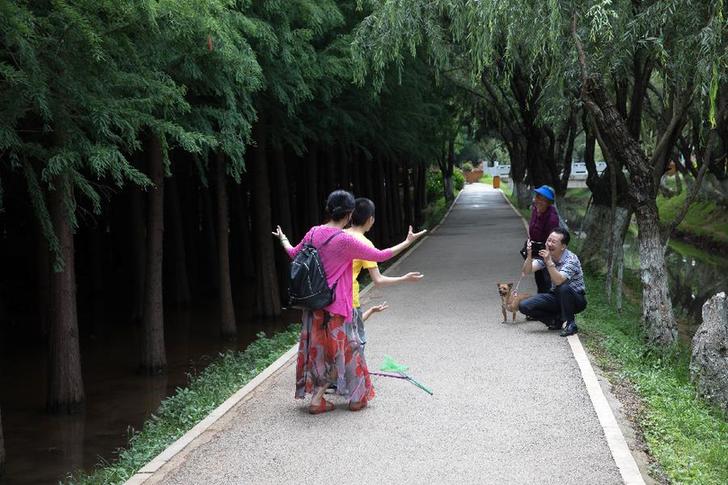7月21日,游客在滇池東岸撈魚河濕地公園留影。 云南省昆明市撈魚河濕地公園位于滇池東岸。近年來,通過當?shù)卣母脑旌椭卫恚瑩启~河濕地公園整體環(huán)境得到明顯改善。 新華社記者 金立旺 攝