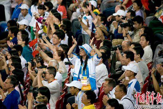 2008年8月21日,國家體育場“鳥巢”,志愿者帶領(lǐng)觀眾為運(yùn)動(dòng)員鼓掌。中國青年報(bào)·中青在線記者 陳劍/攝