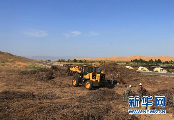 在內(nèi)蒙古鄂爾多斯市杭錦旗,工人為新修的穿沙公路制作沙障(7月26日攝)。新華社記者 鄒予 攝