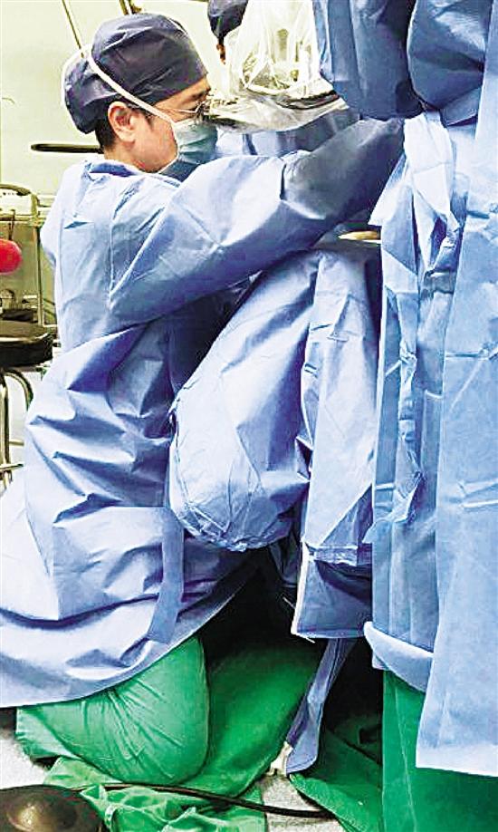 為了達(dá)到最佳手術(shù)效果,浙江省人民醫(yī)院60歲的神經(jīng)外科醫(yī)生陳書達(dá)跪地三小時(shí)為病人完成手術(shù)。