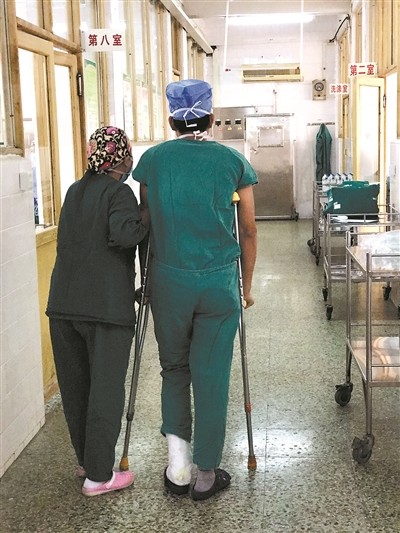 泗陽(yáng)縣中醫(yī)院泌尿外科醫(yī)生劉玉忠為擇期手術(shù)病人拄拐上陣,堅(jiān)持手術(shù)。