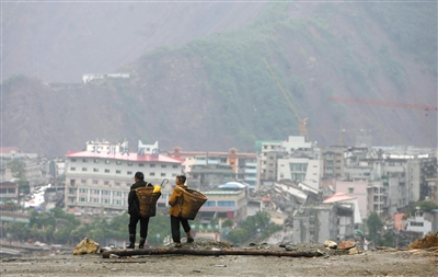 2008年6月22日,北川萬(wàn)名災(zāi)民雨中搬家。資料圖片/新京報(bào)記者 薛珺 攝