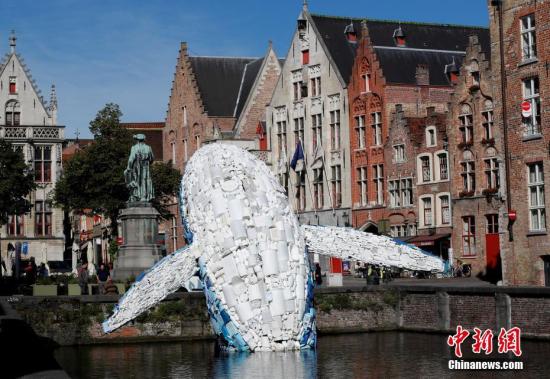 資料圖:當(dāng)?shù)貢r間7月2日,來自紐約布魯克林的建筑設(shè)計公司StudioKCA用從海洋中打撈起來的5噸塑料垃圾,打造了一個38英尺(約11.6米)高的巨型鯨魚“摩天大樓”(Skyscraper)。提醒人們關(guān)注塑料污染。