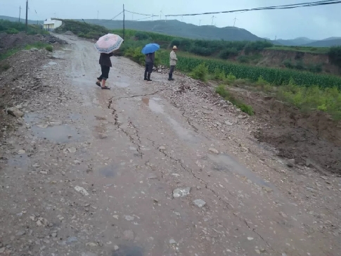 村民查看路況。山洪被堵在路的一側(cè),路面已經(jīng)下沉。