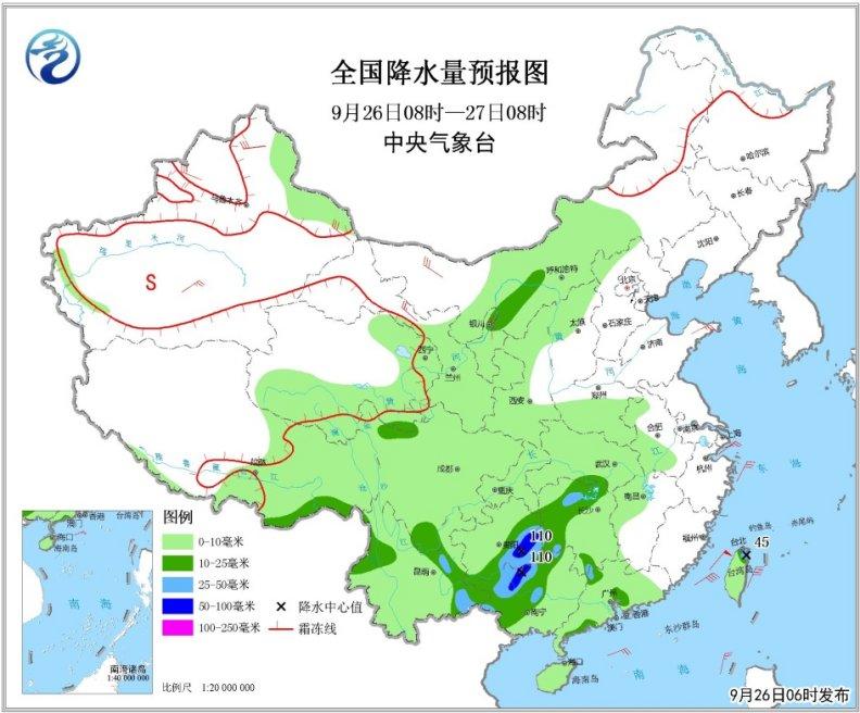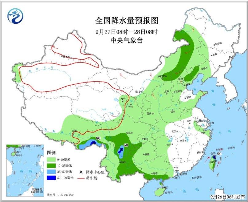 圖1 全國降水量預報圖(9月26日08時-27日08時)