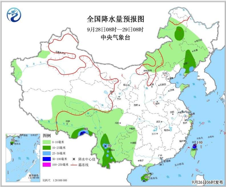 9月28日08時至29日08時,內蒙古中東部、東北地區(qū)中南部、西南地區(qū)西南部和海南島大部以及西藏中東部等地的部分地區(qū)有中到大雨,局地有暴雨或大暴雨(50~140毫米)(見圖3)。東海大部海域、臺灣海峽、臺灣以東洋面、南海東北部海域、巴士海峽將有7~8級、陣風9~10級大風,其中東海東南部海域、臺灣以東洋面的部分海域風力可達9~11級、陣風12~13級。