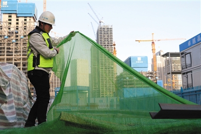 今年2月,中國鐵物大廈項目工地配備網(wǎng)眼更細(xì)密的防塵網(wǎng),有助更好控制揚(yáng)塵污染。 資料圖片/新京報記者 吳江 攝