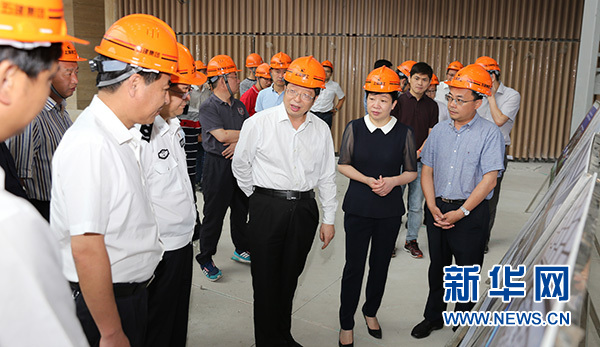 浙江省湖州市委副書(shū)記、市長(zhǎng)錢(qián)三雄(前右三)檢查位于德清縣的首屆聯(lián)合國(guó)世界地理信息大會(huì)項(xiàng)目建設(shè)(2018年6月10日攝)。新華社發(fā)