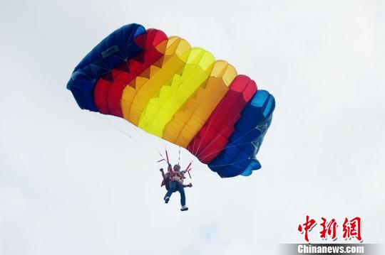 當(dāng)天下午,黃龍洞景區(qū)空氣能見(jiàn)度尚好,在肉眼清晰可見(jiàn)的范圍內(nèi),只見(jiàn)石春艷從搭乘的小松鼠直升機(jī)的機(jī)艙內(nèi)一躍而出,迅速打開(kāi)降落傘,呼吸之間成功降落在哈利路亞音樂(lè)廳的綠蔭屋頂之上。據(jù)悉,石春艷此次空中200米自由落體的運(yùn)動(dòng)時(shí)間在6.32秒左右,在空中調(diào)整姿態(tài)、打開(kāi)傘包的時(shí)間非常短暫。