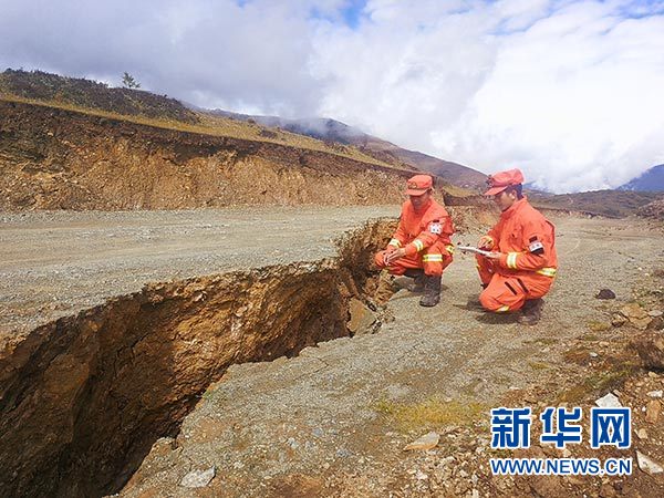 先遣隊(duì)員在波公村勘察地質(zhì)災(zāi)害情況(10月13日攝)。 新華社發(fā)(夏能 攝)