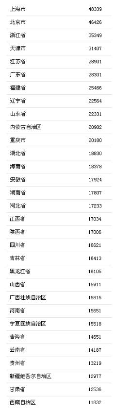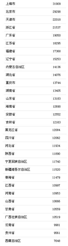 國(guó)家統(tǒng)計(jì)局公布的31省份居民人均可支配收入顯示,上海、北京、浙江前三季度居民人均可支配收入排名前三。