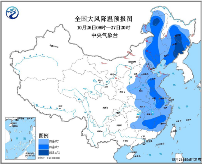 圖為全國大風(fēng)降溫預(yù)報(bào)圖(26日08時(shí)-27日20時(shí))