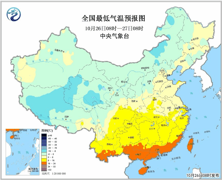 圖為全國最低氣溫預(yù)報(bào)圖(26日08時(shí)-29日08時(shí))