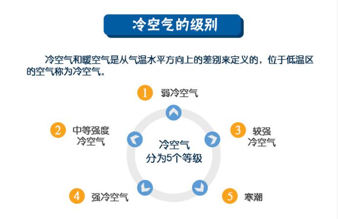 根據(jù)強(qiáng)弱程度,我國將冷空氣分為五個(gè)等級(jí):弱冷空氣、中等強(qiáng)度冷空氣、較強(qiáng)冷空氣、強(qiáng)冷空氣和寒潮。