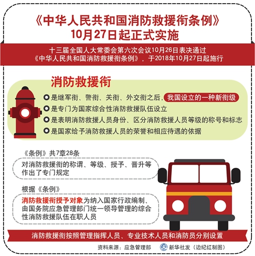 新華社北京10月26日電(記者葉昊鳴)記者26日從應(yīng)急管理部了解到,十三屆全國(guó)人大常委會(huì)第六次會(huì)議當(dāng)日表決通過(guò)《中華人民共和國(guó)消防救援銜條例》,于2018年10月27日起施行。