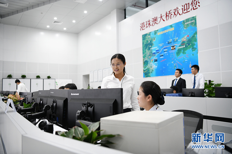 港珠澳大橋管理局營(yíng)運(yùn)管理部部長(zhǎng)江曉霞(中間站立者)在調(diào)度中心查看大橋車輛通行情況(10月24日攝)。新華社記者梁旭攝