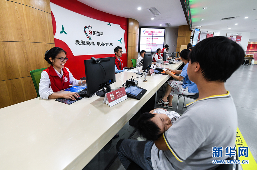 在深圳龍華區(qū)民治街道北站社區(qū)黨群服務(wù)中心綜合服務(wù)大廳,工作人員為社區(qū)居民辦理業(yè)務(wù)(10月24日攝)。新華社記者毛思倩攝