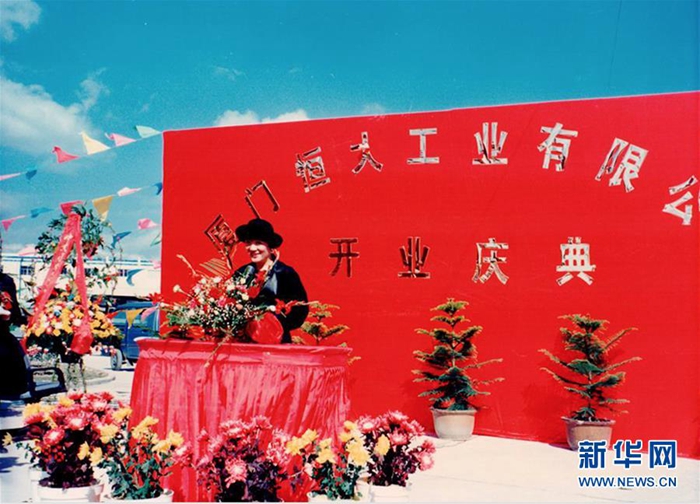 上世紀(jì)90年代初,黃紫玉在廈門的公司成立時站在紅色背景板前講話(受訪者供圖)。 新華社發(fā)