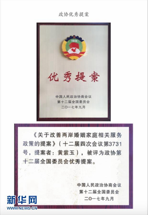 黃紫玉的《關(guān)于改善兩岸婚姻家庭相關(guān)服務(wù)政策的提案》被評為政協(xié)第十二屆全國委員會優(yōu)秀提案(受訪者供圖)。新華社發(fā)