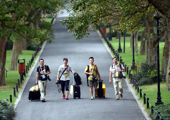 圖為金立旺(左一)2016年9月4日在西湖蘇堤準(zhǔn)備采訪G20峰會。